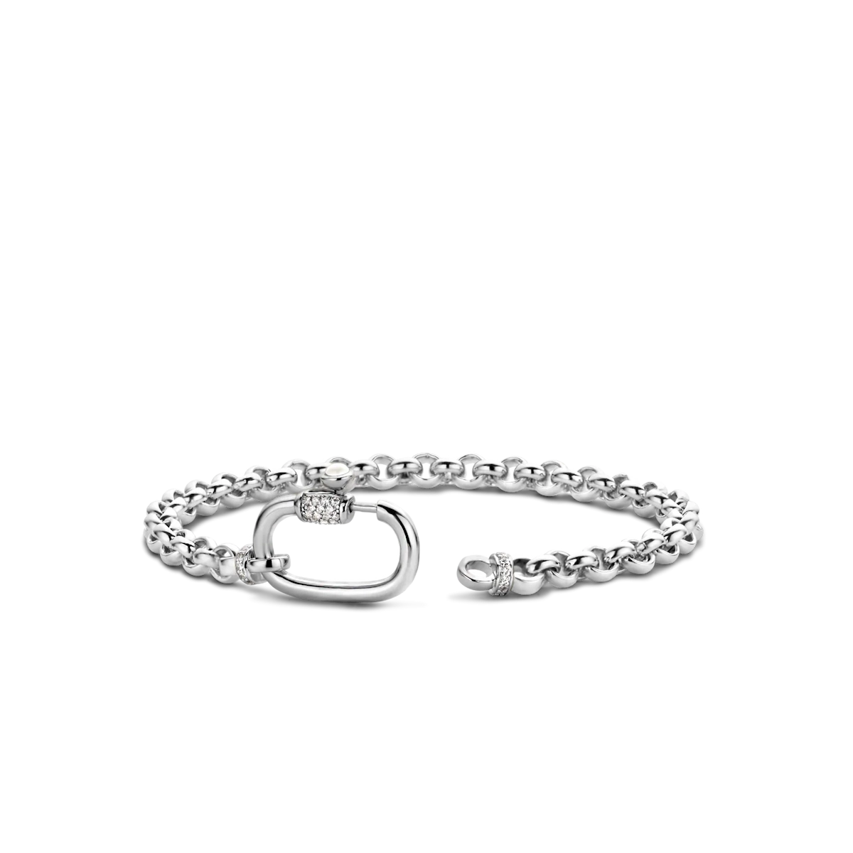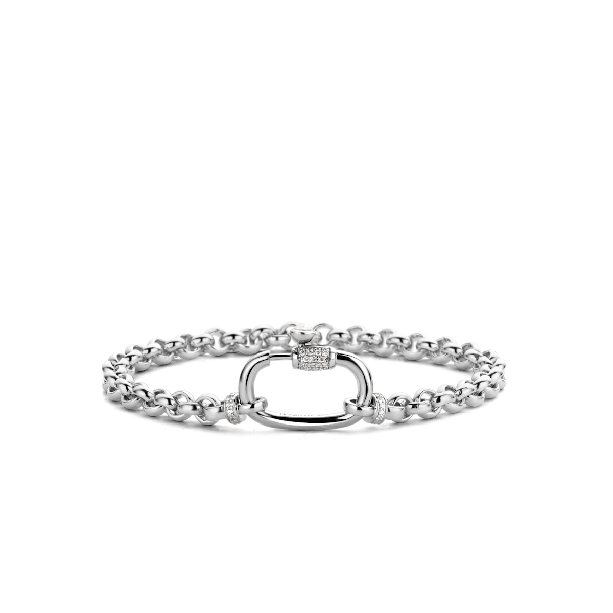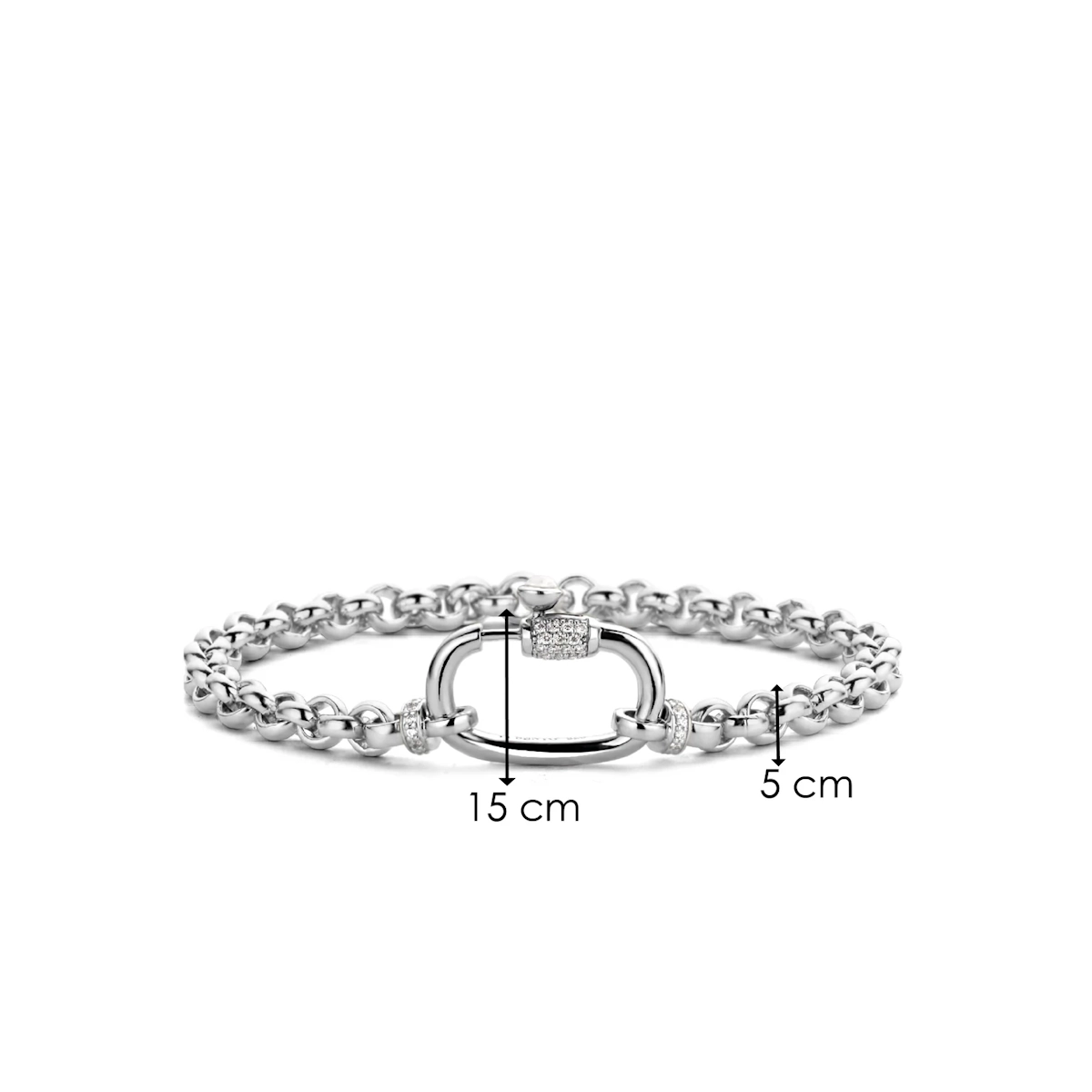 - Design: Il bracciale è composto da un susseguirsi di maglie in argento. La chiusura di sicurezza, che funge da elemento centrale decorativo, è impreziosita da pavé di zirconi cubici bianchi e una pietra di madreperla, conferendo un tocco lussuoso.