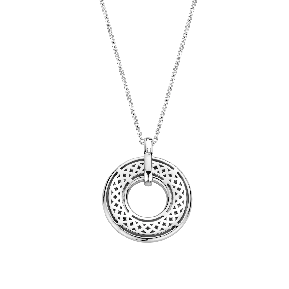 - Design: Il pendente presenta elementi tondi che si intersecano. Lo strato centrale è adornato da una fila scintillante di zirconi cubici bianchi, aggiungendo un tocco di brillantezza.