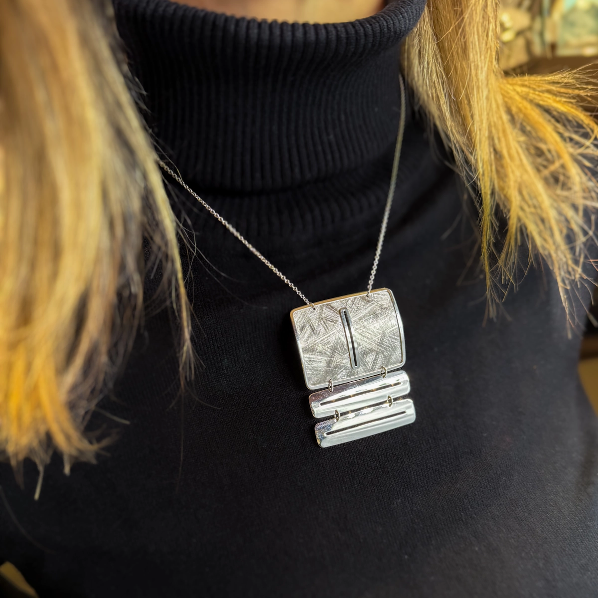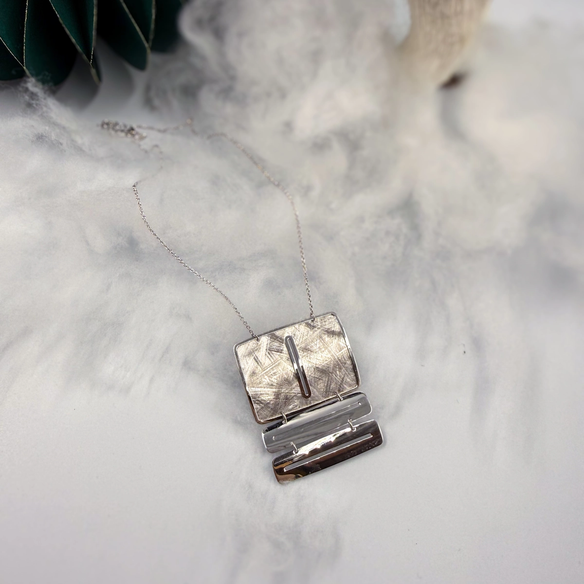 Elegante e ricca di personalità, questa collana in Argento 925 presenta un pendente dal design contemporaneo, composto da una piastra superiore con una raffinata texture incisa e da due elementi rettangolari lisci collegati tra loro. Le superfici alternano finiture satinate e lucide, creando un affascinante gioco di luci e geometrie.