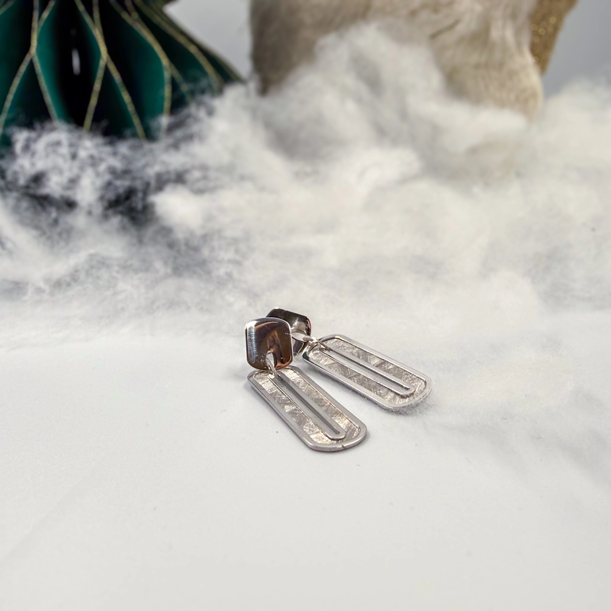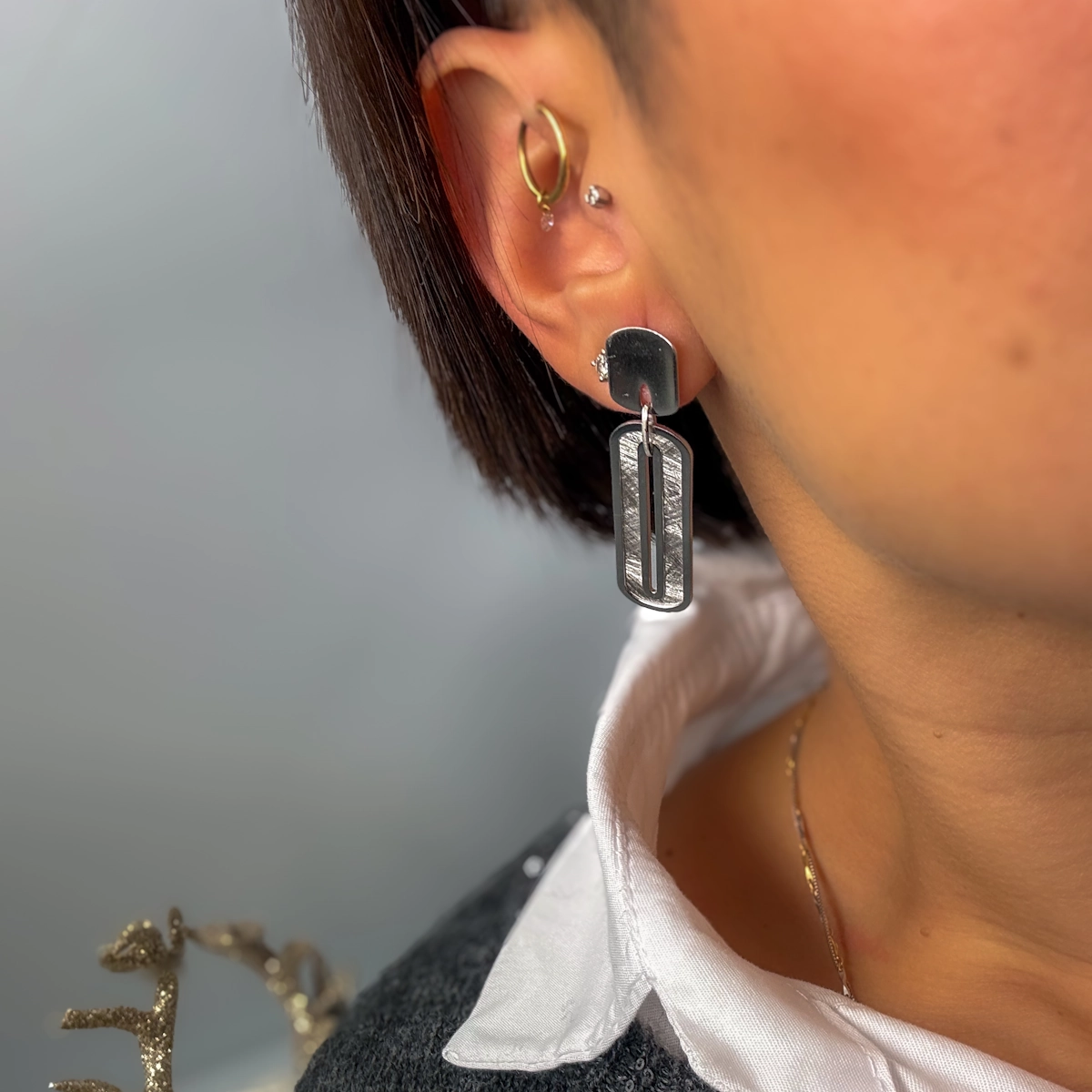 Realizzati in Argento 925, questi orecchini pendenti uniscono linee pulite ed eleganza contemporanea. Il design presenta una piccola placca superiore lucida da cui scendono due elementi allungati con una raffinata texture incisa, creando un delicato movimento e un equilibrio perfetto tra superfici lisce e materiche.