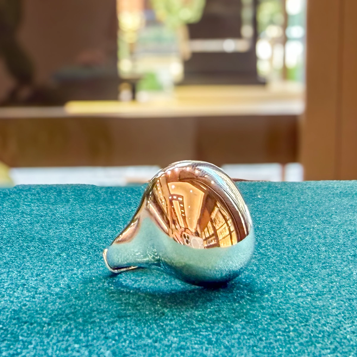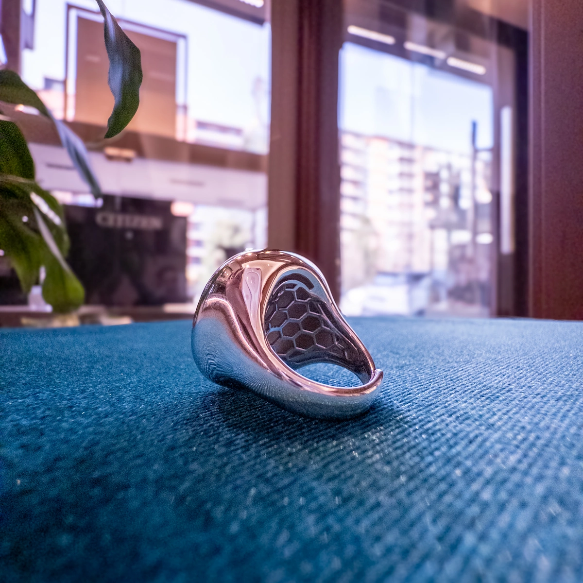 L’essenza del minimalismo contemporaneo si fonde con forme sinuose in questo anello unico. Caratterizzato da una struttura bold e linee fluide, questo gioiello sembra metallo fuso che si modella perfettamente sulla tua mano, creando un gioco di riflessi ipnotico.