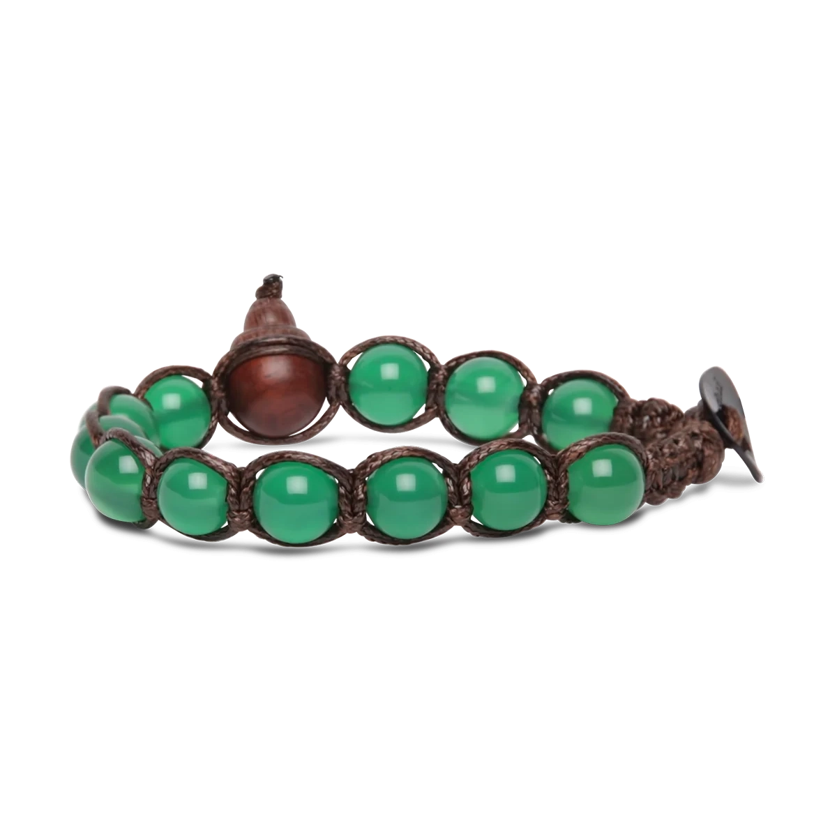 Bracciale originale tibetano Tamashii® realizzato con pietra naturale Agata verde e cordoncino marrone.