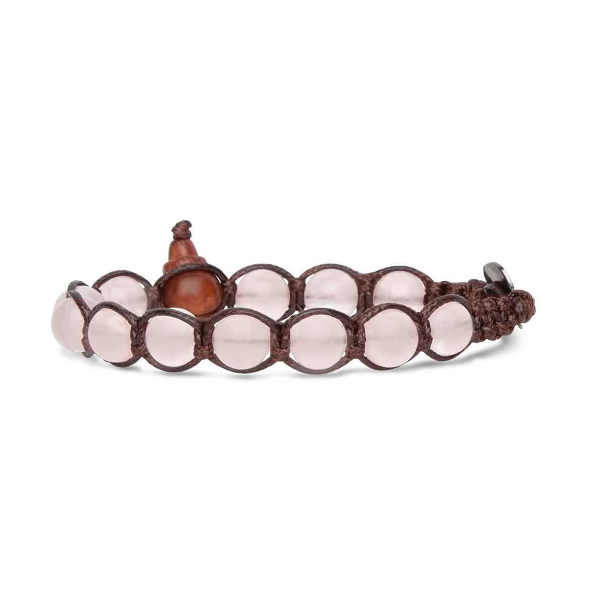 Bracciale originale tibetano Tamashii® realizzato con pietra naturale Quarzo rosa e cordoncino marrone.