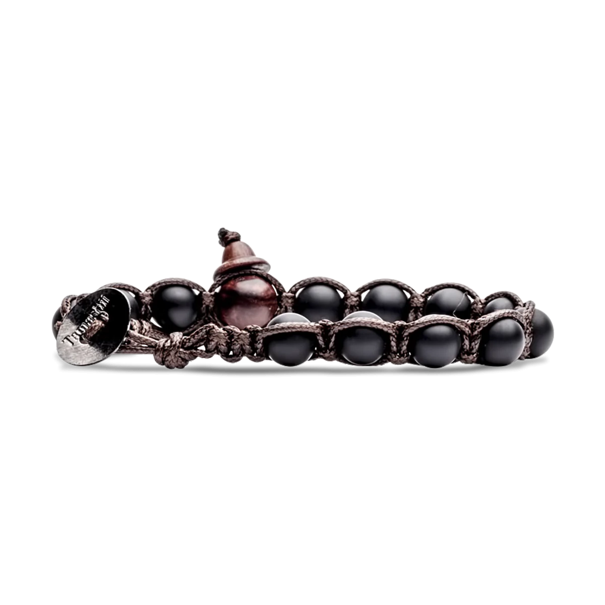Bracciale originale tibetano Tamashii® realizzato con pietra naturale Onice nero Satinato e cordoncino marrone.