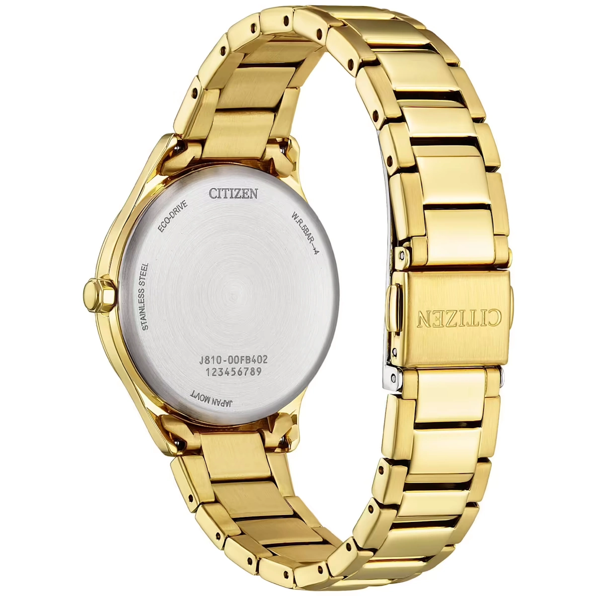 Orologio di Citizen della collezione OF Collection 2026. Orologio eco drive da donna con cassa in acciaio IP oro e diametro di 33,5 mm; quadrante verde con indici applicati e vetro minerale. Bracciale in acciaio IP oro con chiusura a pulsante. Resistenza all’acqua di 5 ATM e movimento eco drive con riserva di carica fino a 8 mesi.