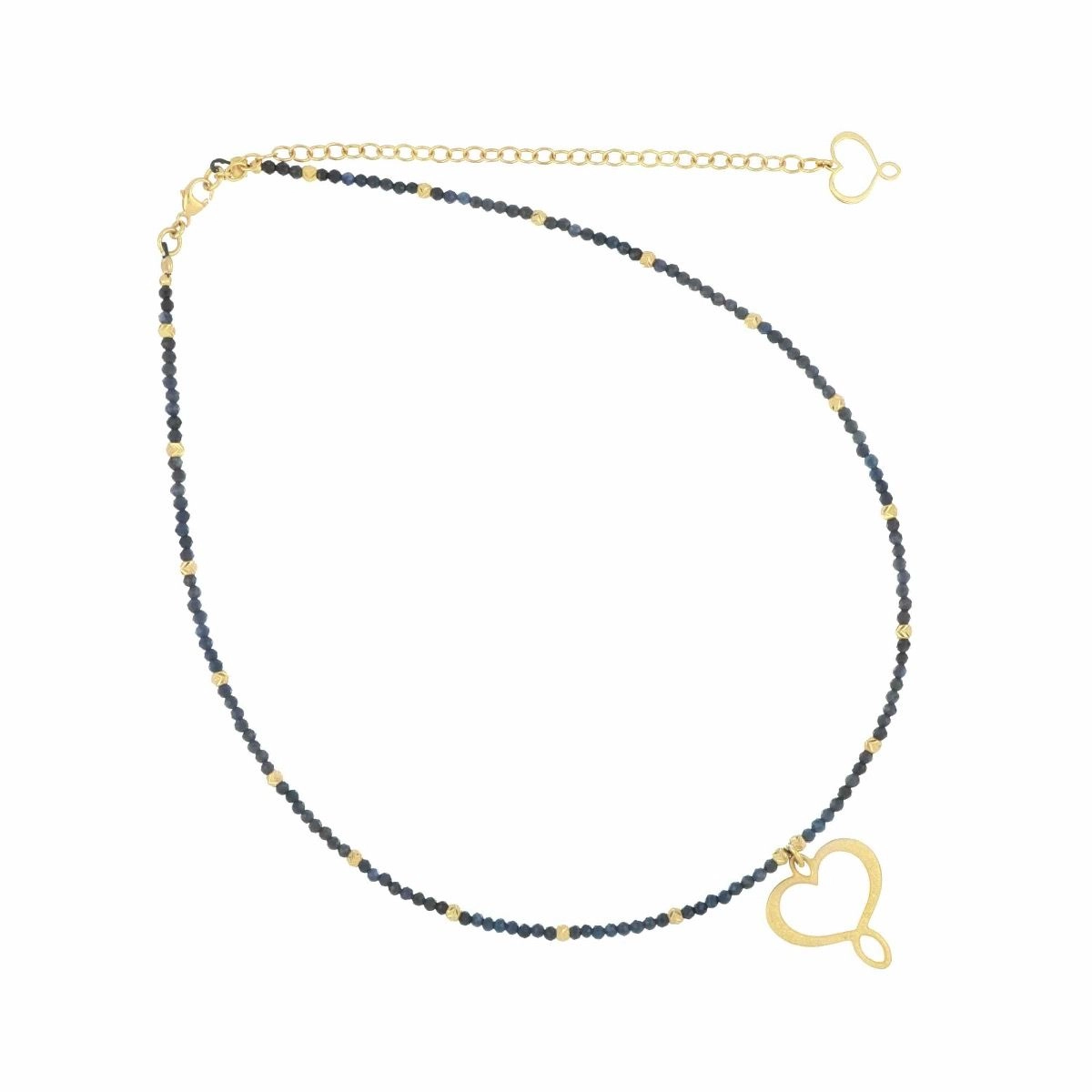 Girocollo in argento 925 con galvanica oro giallo ad alto spessore e ad alta resistenza. Il Girocollo presenta pietre di zaffiro sfaccettato, elementi decorativi in argento e cuore maman satinato pendente di dimensione 18mm.