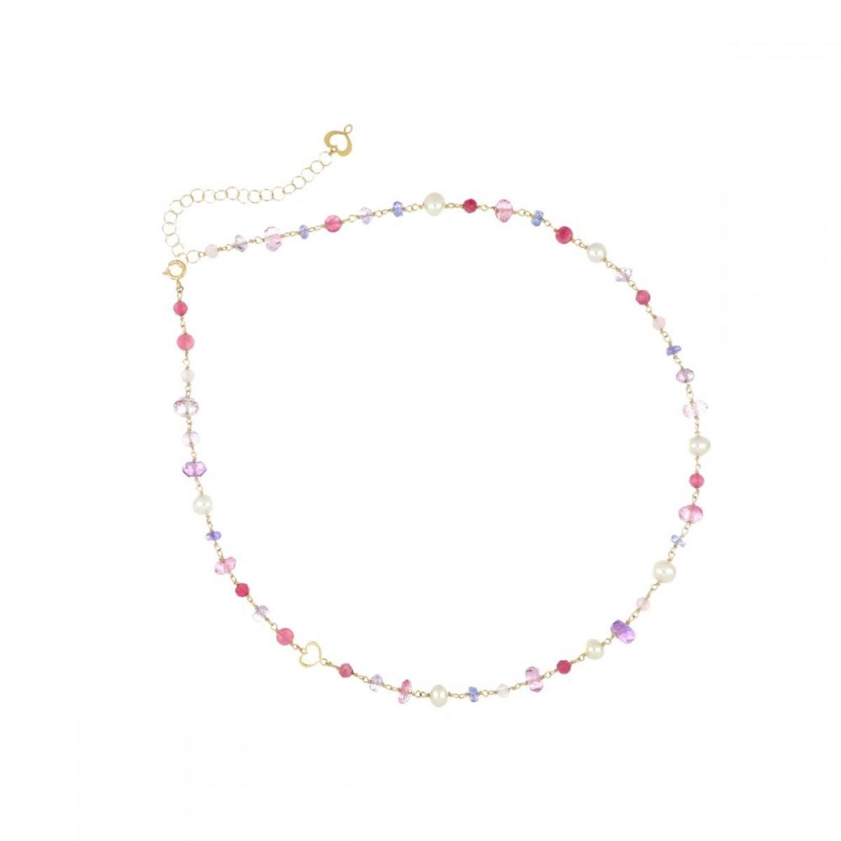 Girocollo in oro giallo 18 carati con pietre di Ametista viola, Topazio rosa, Tormalina rosa, Tanzanite e Perla bianca alternate a catena e cuore maman traforato.