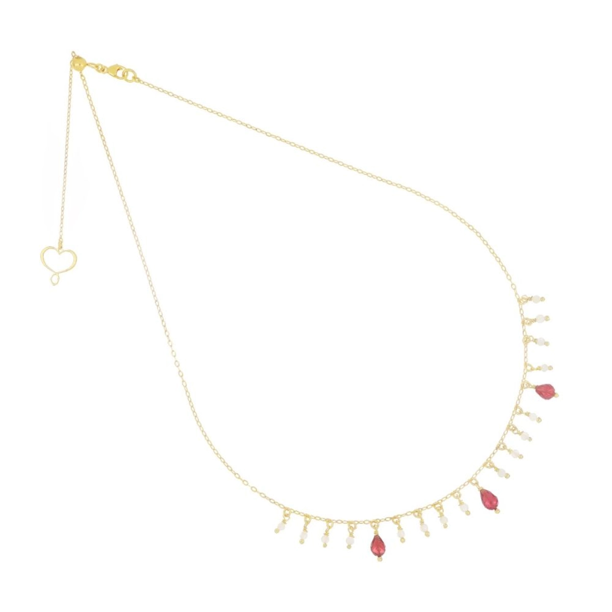 Presenta una serie di perle pendenti e tre gocce di granato pendenti.