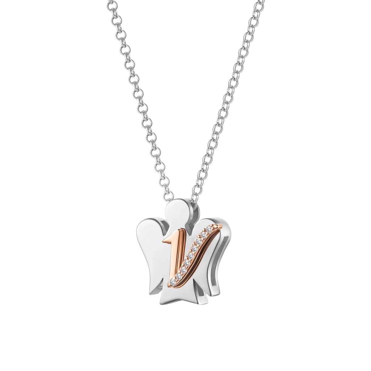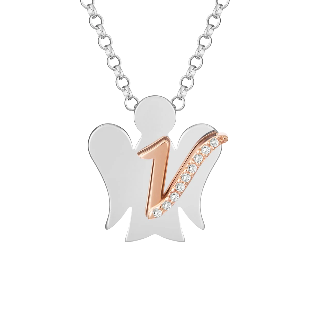 Collana in argento con angelo, lettera in argento rosato e zirconi bianchi.