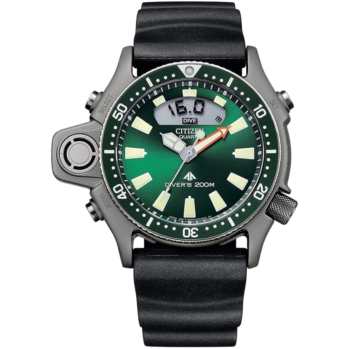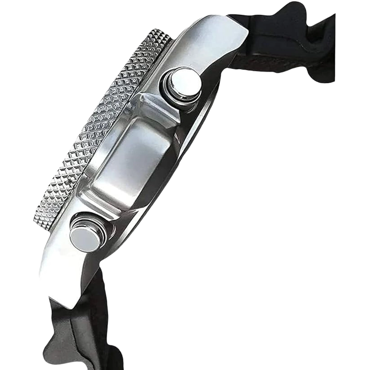 Orario (ore, minuti e secondi AM/PM), Calendario completo, Suoneria, Cronografo a 1/100 di sec con rilevamento di tempi parziali. Rilevazione dati di immersione e relativa memorizzazione. Allarmi di immersione. Controllo carica batteria. Sensore di profondità.