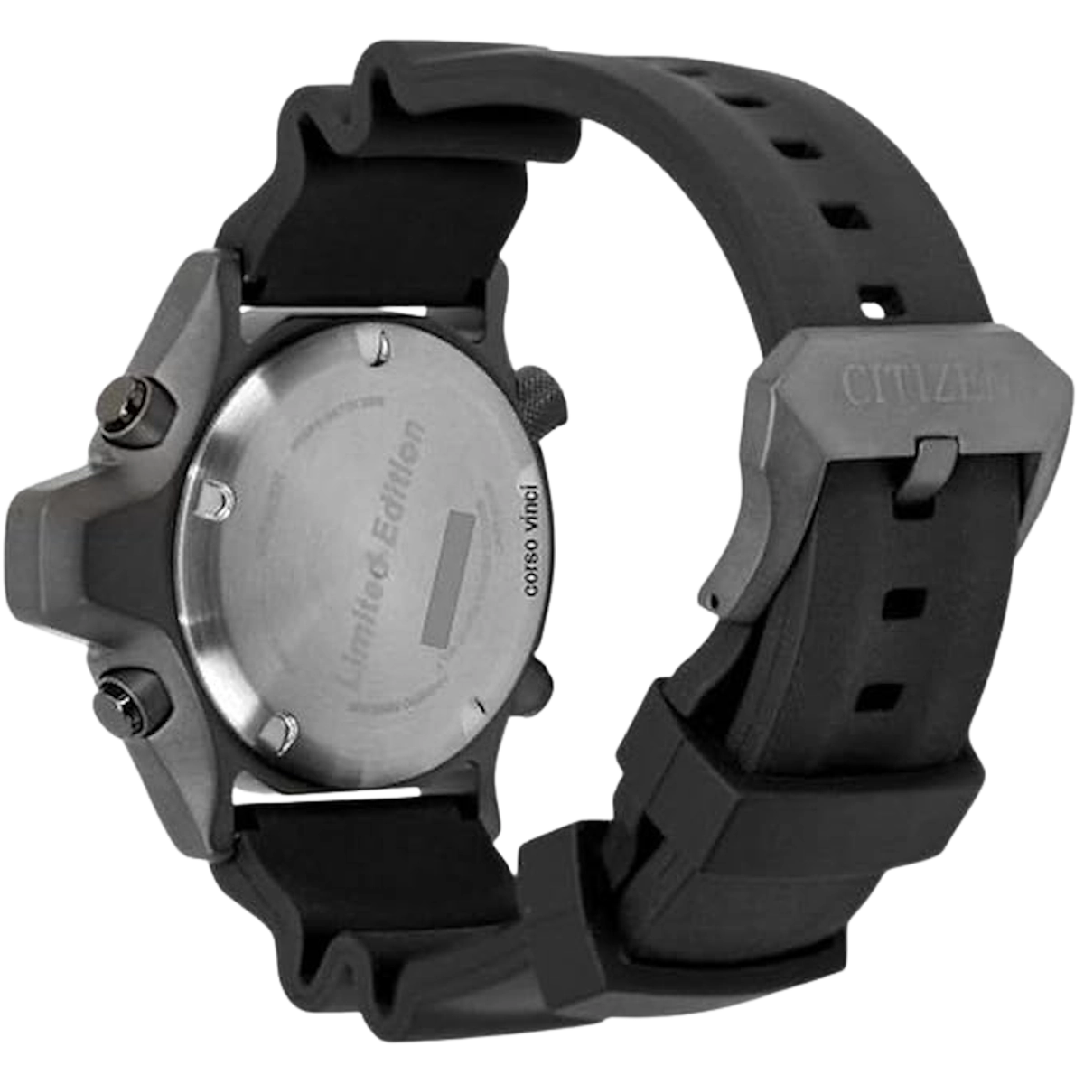 Cassa in acciaio con finitura IP grey, cinturino in morbido poliuretano. Indici e sfere ad alta visibilità. Fondo e corona serrati a vite. Ghiera girevole uni-direzionale zigrinata. Vetro minerale. WR 20bar.