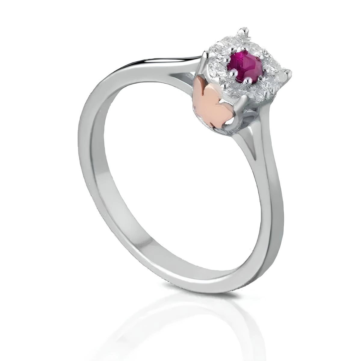 Anello in oro bianco con Angeli in oro rosa, diamanti e rubino.