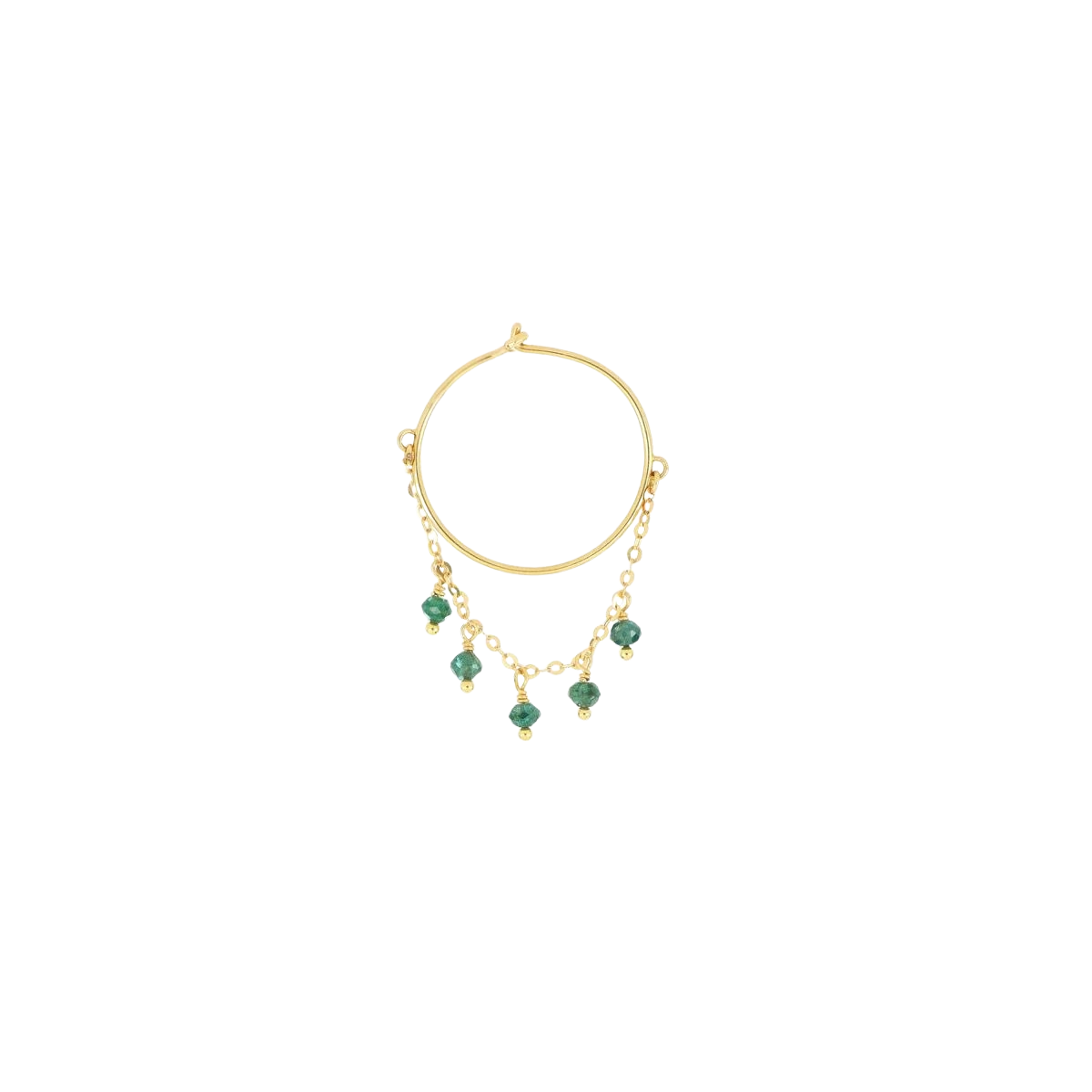 L’orecchino presenta una catena pendente con cinque gocce pendenti di diamante verde.