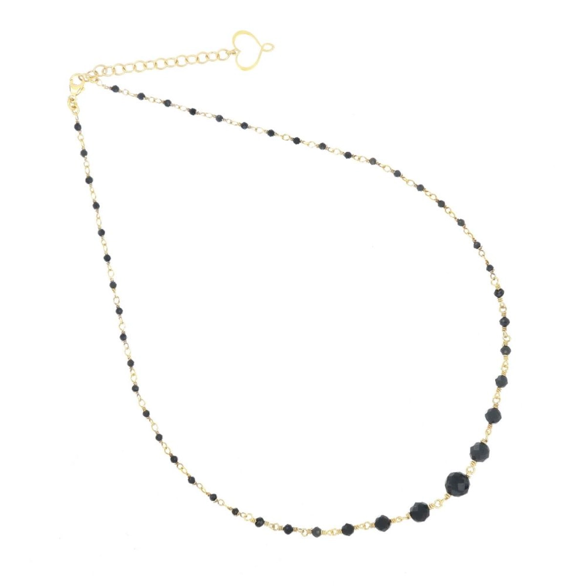 Rosario in argento 925 con galvanica oro giallo ad alto spessore e ad alta resistenza. Presenta pietre di spinello in diverse dimensioni.